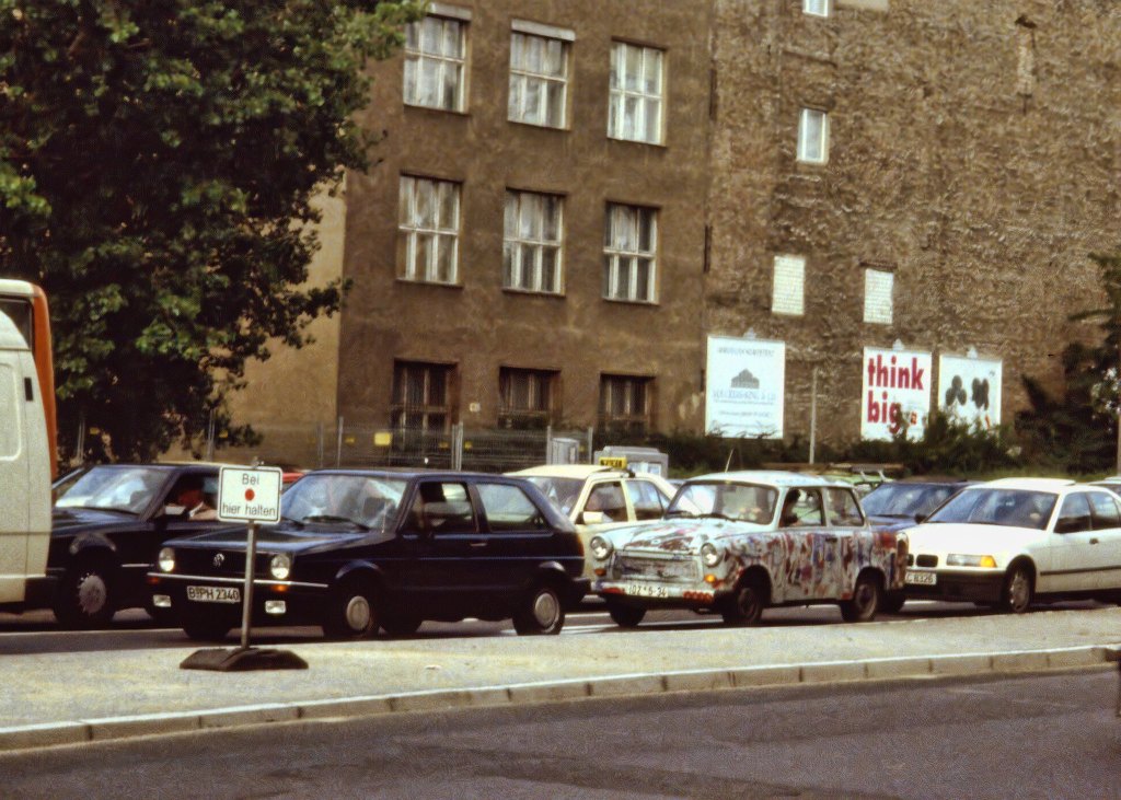 The place was busy with tourists, dodging cars, buses, and sidewalk salespeople. It once stood just behind the Wall, and had been off-limits for nearly 30 years. But in November 1989, it suddenly became accessible to those from the East and West. In 1992, much of the ground that had been just behind the wall stood out like a scar that tore through the city and countryside. The East Germans had cleared out the land behind the Wall, or abandoned the buildings near enough to allow sightlines across the border, and much of this area was still barren. Step through the gate heading West, and look north and south, and all you would see was a partial, recently paved street. Piles of rocks (not the Wall). A few new buildings. And a lot of construction.